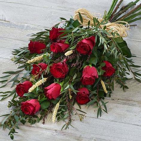 A dozen roses contrast beautifully with silvery eucalyptus foliage and natural elements including dried wheat, natural birch and a raffia bow and created in an foam base.