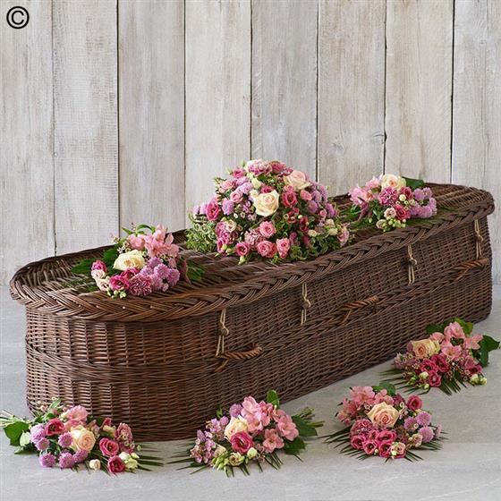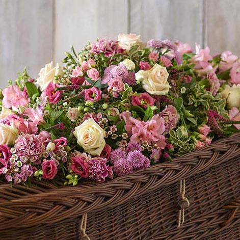 A flowing style of spray that covers the top of the casket with a profusion of blooms including lisianthus, alstroemeria, roses and chrysanthemums. This beautiful spray can also be deconstructed for friends and family to take home.
