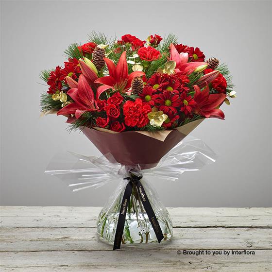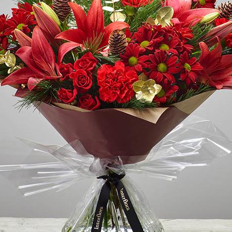 Red asiatic lilies, red spray roses, red carnations and red spray chrysanthemums with gold eucalyptus, pine and salal, hand-tied, wrapped and presented in Interflora gift packaging.