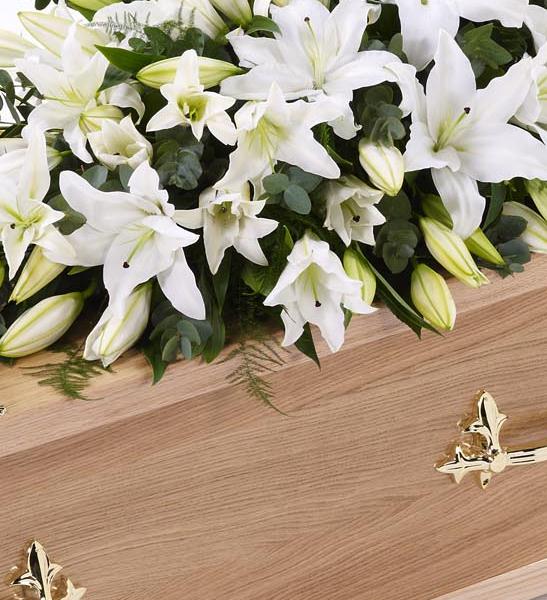 A blanket of white Oriental Lily is beautifully complemented by an array of luxurious deep green leaves to create this simple but striking casket spray. Approximate height 153cm (5ft).