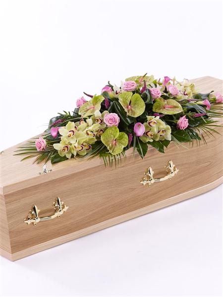 This distinctive casket spray brings together the soft green shades of cymbidium orchids and green anthurium, with delicate pink calla Lily, veronica and large-headed Rose. The spray is finished with aspidistra, aralia leaves, palm leaves and China grass. Approximate height 122cm (4ft).