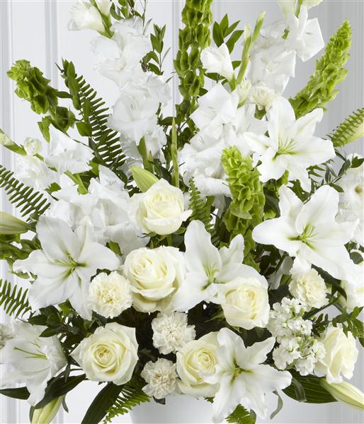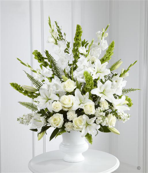 This stunning urn arrangment is a beautiful expression of peace and soft serenity. White roses, carnations, gladioli, stocks and Oriental Lily are accented with the bright green Stems of molucella and an assortment of foliage.