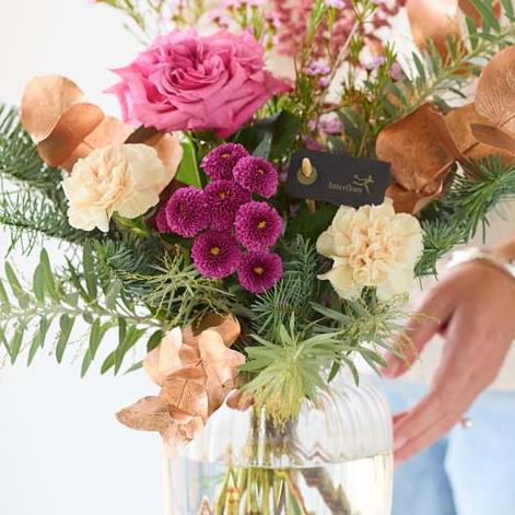 Make sure they don't lift a finger with season with gorgeous blooms already shown off beautifully in a handblown vase. It'll feature gorgeous fresh blooms and foliage. Expect cerise and purple tones, plus blooms in soft pink, peach or lilac shades. It might also feature dried flowers or foliage painted in copper or rose gold.